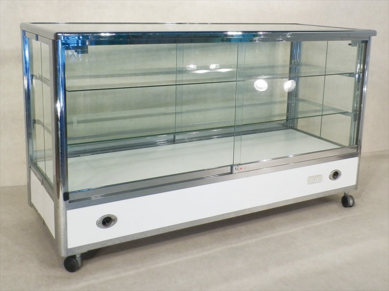ガラス張りで中に蛍光灯がついており中の商品を照らせるのでとてもキレイに商品を展示することが可能です。 ガラスの中棚もついておりたくさんの商品の展示が可能となります。 宝飾品などより奇麗に美しく魅せて展示したいものがあるときは絶対におススメです!