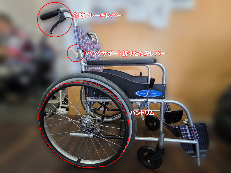 こちらは、自分で漕いで車椅子を走らせる事のできる、ハンドリムがタイヤについているタイプの車椅子となります。