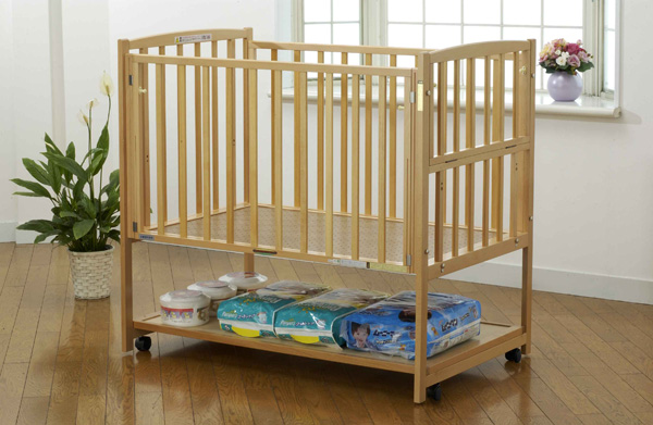 腰をかがめず楽な姿勢で赤ちゃんのお世話が出来ます。また、床板の下は、収納も可能です。
