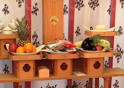 野菜・果物などのお供えを整えて据えやすく、祭壇まわりをきちんと仕立ててくれます。
